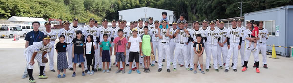 8月21日(火)広島東洋カープと行われたウエスタン・リーグ公式戦前日に矢野ファーム監督、コーチ、選手らチーム一行と揚塩球団社長が、西日本豪雨で甚大な被害を受けた倉敷市真備町地区にある3つの小学校の避難所を訪問し、避難住民や地元の子供たちと交流を行いました。