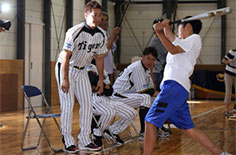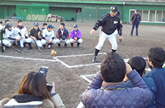 生徒の皆さんの歓迎を受けながら登場した選手達は、グラウンドでキャッチボールをしたり、ピッチングやバッティングの実技指導を行ったり、質問コーナーなどでふれあいました。