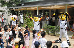 球団マスコットの「トラッキー」、「ラッキー」、「キー太」が球場を飛び出して、コミュニティ活動に参加しています。