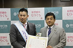 12月3日(木)、「もりぐち夢・未来大使」の委嘱式が行われ、西端勝樹市長から阪神タイガースの岩田投手に対して委嘱状が交付されました。