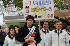12月4日(金)、守屋功輝選手が、阪神尼崎駅前(北側)で行われた「人権週間街頭キャンペーン」に 一日人権擁護委員として参加し、人権保護などを呼びかけました。