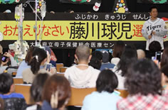 2月26日(木)、近畿大学OBである藤井彰人選手が近畿大学医学部付属病院を訪問し、交流会に参加しました。入院中の子供たちとその家族と一緒に、トークショー・ミニゲーム・記念写真撮影会などで楽しみました。関本賢太郎選手
