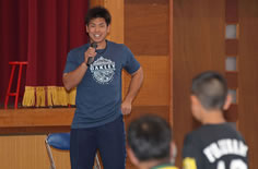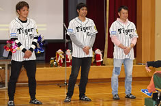 梅野隆太郎選手、中谷将大選手、髙山俊選手、板山祐太郎選手、北條史也選手が宜野座村立宜野座小学校を訪問