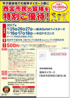 “西宮市民デー”として、下記6試合において地元西宮市民の合計10,000名様を対象に抽選で3塁アルプス指定席とレフト外野指定席を、特別価格(500円 税込<おとな/こども共通>)でご優待しました。
