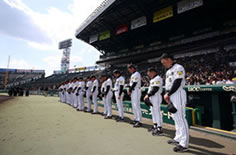 甲子園球場での試合前に両軍の監督、コーチ、選手が黙とう
