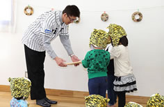 園児より西宮市からの感謝状を送られた能見選手は、「オリジナル輪投げ」を使ったゲームや記念写真を撮るなどして園児たちとふれあい、また、園児からは御礼に歌のプレゼントをいただきました。