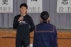 糸原健斗選手、島田海吏選手、植田海選手、望月惇志選手、才木浩人選手が宜野座村立宜野座中学校を訪問
