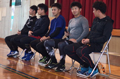 近本選手、木浪選手、熊谷選手、島田選手、植田選手が宜野座村立松田小学校を訪問