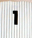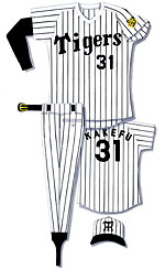 阪神タイガース伝統の丸数字の背番号がはじめて登場したのは1953年。ホーム用ユニフォームに使用されたのが最初だった。しかしそれも84年、このユニフォームを最後に廃止となってしまった。ところがなぜか1の書体だけが生き残る。写真のような書体で、この形の1は、2000年まで使われ続けた。 |