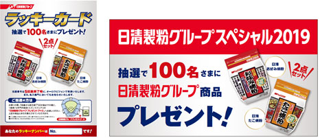 各入場門にて10,000名様に、“ラッキーナンバー付きカード”を先着配布。当選番号は、試合中(5回裏終了時)にオーロラビジョンで発表いたします。ご当選の方には、『日清 お好み焼粉 & たこ焼粉』の2点セットをプレゼント!