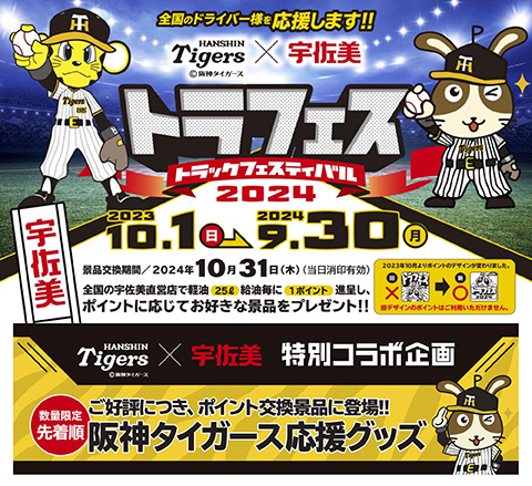全国のガソリンスタンド宇佐美直営店で軽油25ℓ給油毎に1ポイント贈呈し、応募したポイント数に応じて、阪神タイガース×宇佐美 限定オリジナルコラボグッズなどの景品を数量限定でプレゼントいたします。