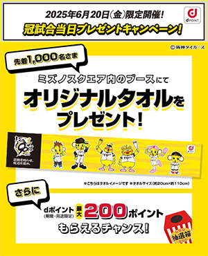 当日ご来場のお客さまのうち、dポイントクラブアプリで阪神タイガースデザインに着せ替えいただいた画面を見せていただくと、オリジナルタオルとdポイント最大200ポイント(期間・用途限定)を先着1,000名へプレゼントいたします。