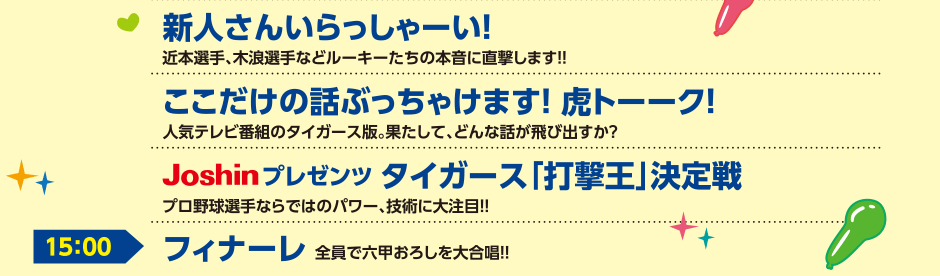 「阪神タイガース公式ファンクラブ会員」または、登録無料の会員制サービス「Tigers iD」に登録済で、当日応募いただいた女性の方の中から抽選で、トラ戦士たちのトークショーにご招待。どんな話が飛び出すか?選手への質問コーナーも予定しています!乞うご期待!