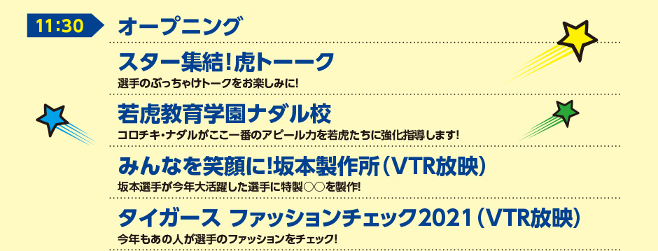 - ファン感謝デー2021を虎テレにて無料視聴できるキャンペーンを実施いたします。詳細はファンクラブ会報誌第4号にて記載いたしますので、そちらをご確認ください。