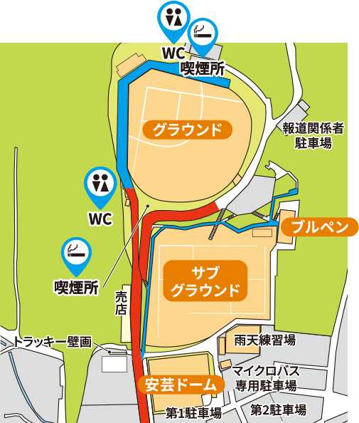 観覧可能エリアにつきましては、下記キャンプ地マップをご参照ください。なお、安芸ドームおよび雨天練習場ではご観覧いただけません。
