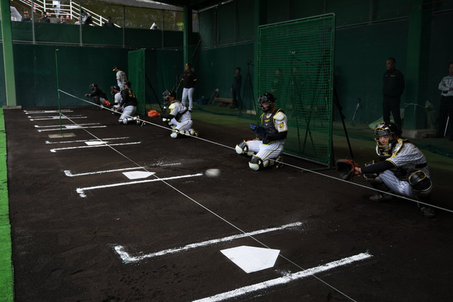 11月1日(金)高知県安芸市で秋季キャンプがスタート。雨の中で歓迎式典が行われたが、練習は安芸ドームなど室内で進行される。ブルペンにはストライクゾーンの高低に2本のゴム紐が張られていた。より高さの意識を持って練習する狙いで過去にも例はあるが、これも藤川イズムを反映したものだ。