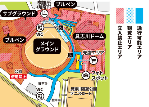 - ※打撃練習や試合の際、ボールがスタンドや球場外に飛び出る可能性がございます。ボールの行方には十分ご注意ください。