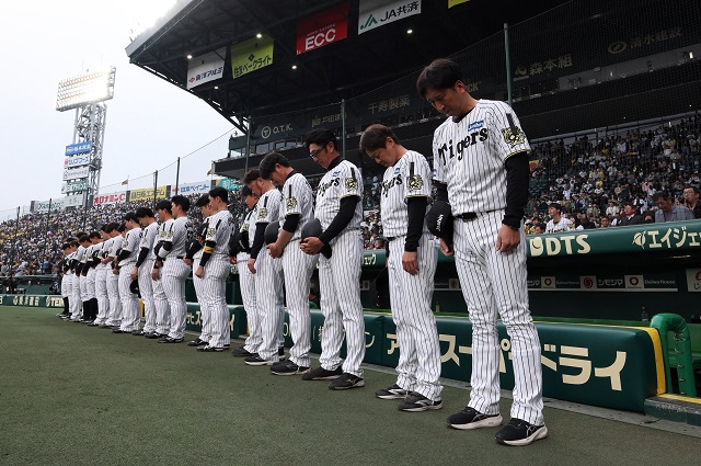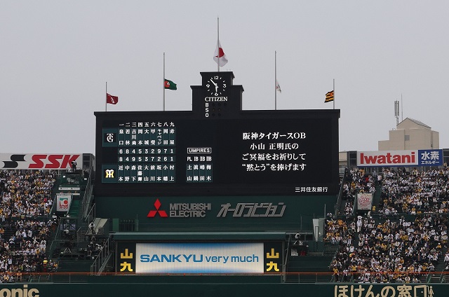 25日(金)、4月18日(金)に逝去された球団OB 小山正明氏に哀悼の意を表し、阪神甲子園球場の球団旗を半旗にし、試合前に黙祷を捧げました。また、この日の対読売ジャイアンツ戦は、阪神タイガースの監督・コーチ・選手は喪章をつけて戦いました。