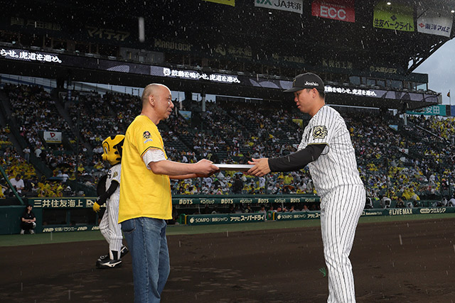 球団選定3・4月度月間最優秀選手に村上頌樹選手が選ばれ、21日(水)、阪神甲子園球場での対読売ジャイアンツ戦の試合前に表彰式を行いました。