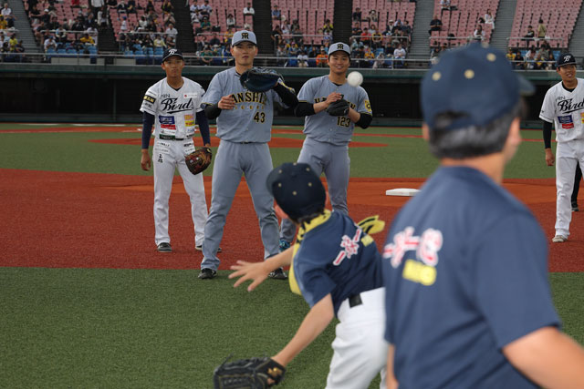 独立リーグ交流試合で実施している1回裏の「オンユアマークス」では、地元・富山の子供たちに、選手からサインボールをプレゼントしました。