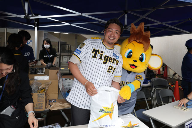 YouTube配信の解説で参戦した秋山拓巳ベースボールアンバサダーがグッズ売り場の一日店長に就任!石川のタイガースファンの皆さまと交流しました。