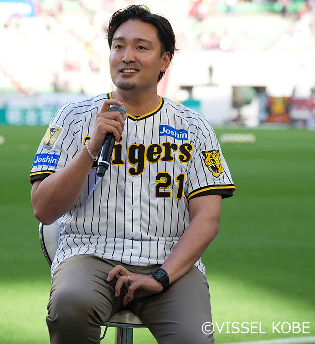 6月15日(日)ノエビアスタジアム神戸に阪神タイガース ベースボールアンバサダーの「秋山拓巳」氏と公式マスコットキャラクターの「トラッキー」が訪問し、試合前のピッチでトークショー、キックインセレモニーを行いました。
