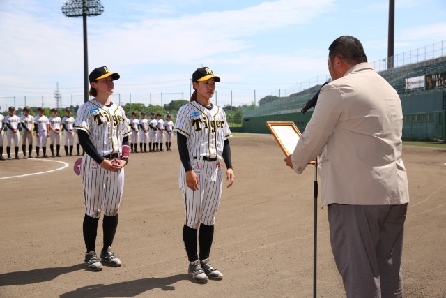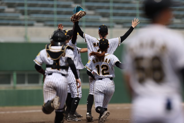 阪神TWの決勝の対戦相手は昨年のトーナメント大会、準決勝で敗れた前年の優勝チームの大体大。今大会でも侍ジャパン代表候補6選手を擁し、2回戦では、今春の女子高校野球選抜大会で優勝した神戸弘陵高を破り、決勝に駒を進めてきた。