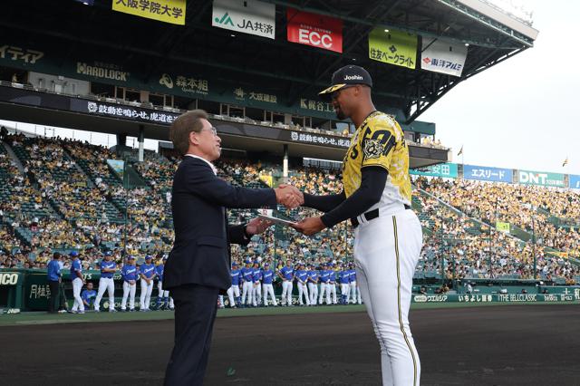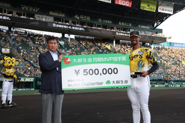 16日(水)、阪神甲子園球場での対中日ドラゴンズ戦の試合前に、「6月度大樹生命月間MVP賞」を受賞したジョン・デュプランティエ選手の表彰式が行われました。