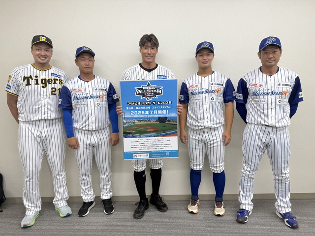 22日(火)、来年富山県で開催される「マイナビオールスターゲーム2026」を記念し、石川県小松市にて阪神タイガース・スペシャルアンバサダーの糸井嘉男氏、ベースボールアンバサダーの秋山拓巳氏、そして地元・石川県の独立リーグ球団・石川ミリオンスターズの岡﨑太一監督、上田大誠選手(小松市出身)、森林秀匡選手(能美市出身)を迎え、北陸地方の子どもたちに向けて野球の基本である「打つ」「捕る」「投げる」を楽しく体験できるイベントを開催しました。