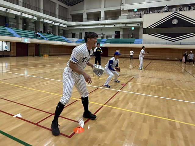 「捕球練習」エリアでは秋山BA、岡﨑監督が、「投げる」「捕る」楽しさを伝え、技術指導を行いました。