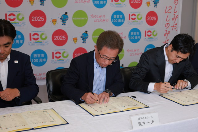 阪神タイガースと西宮市・西宮市教育員会との間で部活動地域展開「プレみや」への連携・協力に関する協定を締結することとなり、29日(火)に西宮市役所にて行われた「西宮市との部活動地域展開に関する連携と協力に関する協定締結式」に粟井一夫社長が参加しました。