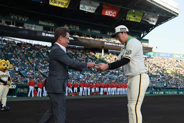 30日(水)、阪神甲子園球場での対広島東洋カープ戦の試合前に、7月21日(月・祝)の東京ドームでの対読売ジャイアンツ戦で「公式戦通算1000本安打」を達成した大山悠輔選手の表彰式が行われました。