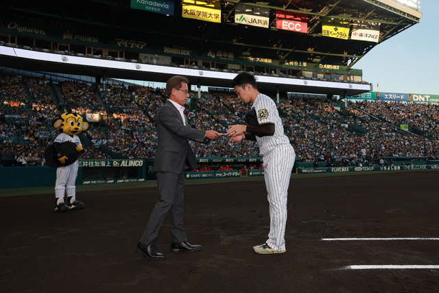 6日(土)、阪神甲子園球場での対広島東洋カープ戦の試合前に、石井大智選手の公式戦通算41試合連続無失点達成を記念し、セレモニーを実施しました。石井大智選手には球団より賞金と記念品が授与されました。