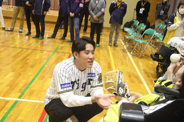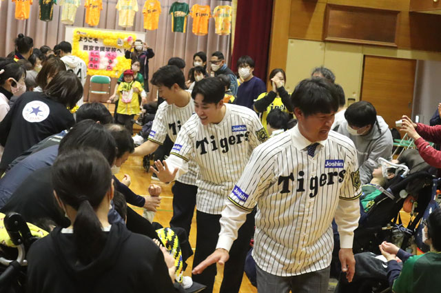 6日(金)、富田蓮選手、門別啓人選手、筒井壮コーチが、西宮市立西宮支援学校を訪問しました。児童生徒の皆さんから歓迎を受けて登場した選手達は、質問コーナーやキャッチボールなどで児童生徒の皆さんとふれあいました。