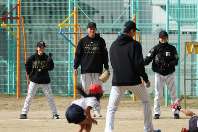 3日(水)、伊原陵人選手、今朝丸裕喜選手、木下里都選手、工藤泰成選手、嶋村麟士朗選手、早川太貴選手、川﨑俊哲選手、津田淳哉選手、福島圭音選手、そしてタイガースアカデミーの歳内宏明コーチ、角菜帆コーチが「尼崎市立浦風小学校」を訪問し、ゲストティーチャーとして約114名の小学3年~6年生の皆さんと、ボールの投げ方を中心とした練習や、選手とのキャッチボール、対戦型ゲームなどをして野球の面白さや楽しさを伝えました。