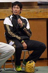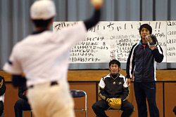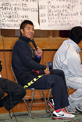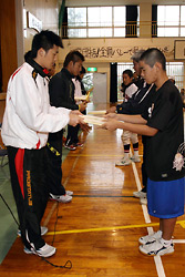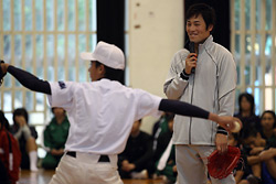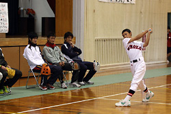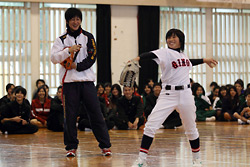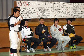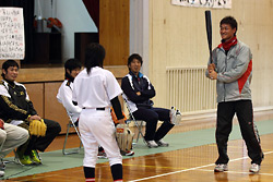 あいにくの雨となり体育館での開催となりましたが、選手と野球部の生徒さんとのキャッチボールががはじまると、見学している生徒さんたちから大きな拍手と歓声があがったり、生徒さんへの技術指導のはずが、一発ギャグを披露選手もいたりと、会場は大いに盛り上がりました。