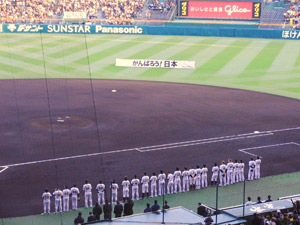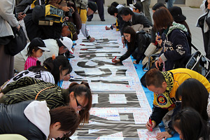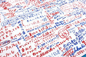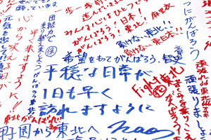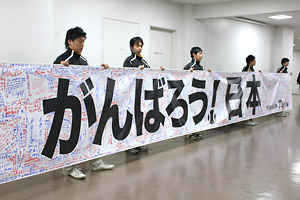 12日(火)試合前ミズノスクエアにて、ファンの皆様に『がんばろう!日本』と書かれた横断幕に被災地への激励メッセージを書いていただきました。