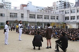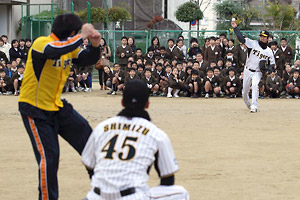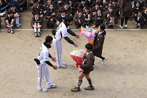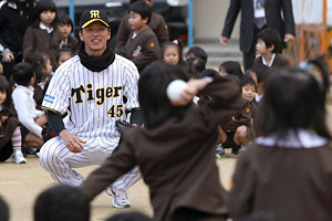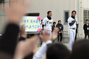 9日(金)、大阪府の『ふれあい事業』の一環として、藤川球児投手と清水誉選手が大阪市立堀江小学校を訪問しました。