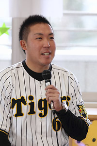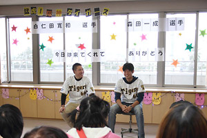 17日(土)、白仁田寛和投手と森田一成選手が西宮市の障害者施設、円勝会ドリーム甲子園を訪問しました。歓迎を受けた選手達は、約150名の施設の皆さんと質問コーナーや的入れゲームなどでふれあいました。