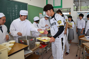 仮設校舎に到着するや、選手たちはユニフォームに着替え5クラスに分かれて教室へ。ちょうどお昼どきで、生徒の皆さんと給食時間を過ごすことに