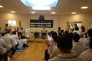 上本選手と鶴選手は、ボールゲームや質問コーナーで施設利用者の方とふれあい楽しい時間を過ごしました。最後には施設利用者とそのご家族の皆さんから2選手へ感謝状と花束が送られました。