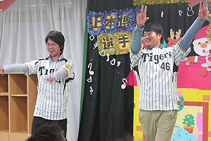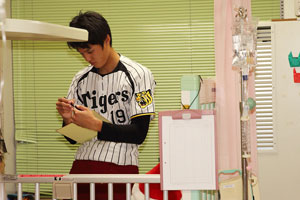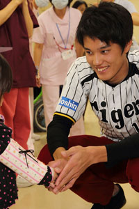 13日(金)には、藤浪晋太郎選手が大阪府立母子保健総合医療センターへ、また19日(木)には、上本博紀選手、鶴直人選手が社会福祉法人四天王寺福祉事業団四天王寺和らぎ苑を訪問しました。