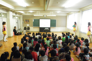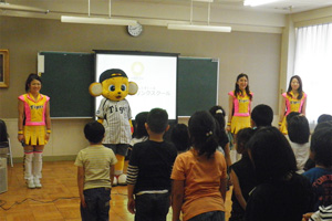 チャイムの音で始まった「ドリームリンクスクール」。「宜しくお願いします!」のみんなの挨拶で授業がスタート。まずは、阪神タイガースの本拠地で、みんなが住んでいる「西宮市」がどんなところかをキー太とTigers Girlsと一緒に学びます。