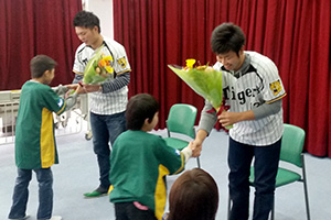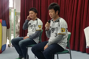 25日(木)、榎田大樹選手と北條史也選手が、四天王寺太子学園(大阪府南河内郡太子町)を訪問しました。