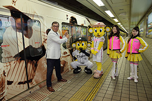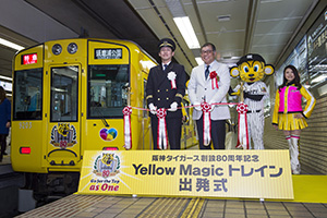 16日(月)、球団創設80周年記念で展開中の“Yellow Magicプロジェクト”の一環として、タイガースイエローに飾られたラッピング電車“Yellow Magicトレイン”の運行が開始され、阪神梅田駅にて出発式を行いました。