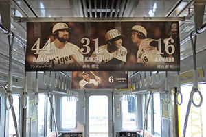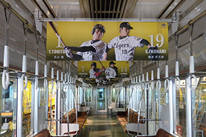 この“Yellow Magicトレイン”は、タイガースイエローを基調とし、選手ならびに80周年メモリアルビジュアルが車体に飾られ車内は、タイガースの選手、メモリアルビジュアルに登場するOB選手が中づりポスターにデザインされたギャラリー仕様となっております。