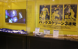 | 80周年特別映像を放映する、 イエローが印象的なファサード。 | ファンにはたまらない レジェンド選手ゆかりの品々の展示。 |