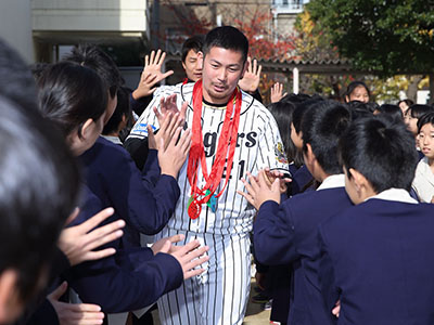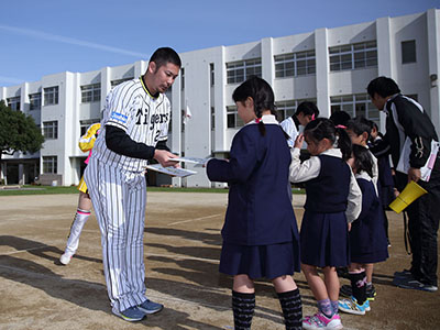 9日(水)、大阪府の『トップアスリート小学校ふれあい事業』の一環として、岩田稔選手と新井良太選手が大阪市立梅香小学校を訪問しました。