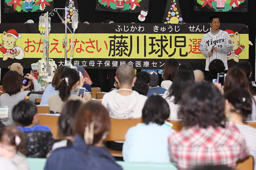 18日(金)、藤川球児選手が、大阪府立母子保険総合医療センター(大阪府和泉市)を訪問。藤川選手は病棟を回ったり、クリスマス会に参加し、子供たちと保護者の方200名とゲームや質問コーナーで楽しい時間を過ごしました。