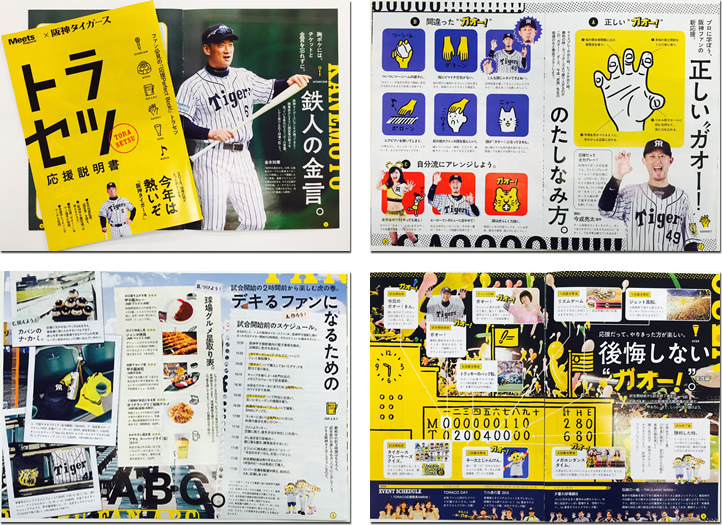 地元関西の情報誌「Meets Regional」(京阪神エルマガジン社発行)とのダブルネームで制作したこの〝応援説明書「トラセツ」″(A5サイズ・12P)は、阪神タイガースの2016年新応援として生まれたファインプレーやタイムリーが出た際にとる「ガォー!」ポーズを今成亮太選手やイラストとともに解説。